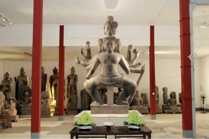 The 5m and seven-ton sculpture was carved from a single block of sandstone – with 10 arms and five faces – dates back to the 10th century from the site of an ancient capital of the Khmer empire, Koh Ker. The temple ruins of Koh Ker in northern Cambodia were listed as a UNESCO World Heritage Site in 2023.