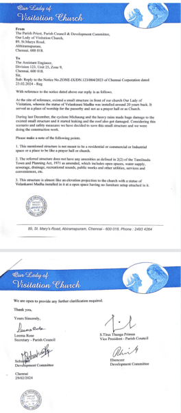 The letter dated February 29, 2024, from the Our Lady of Visitation Church is not just a response—it is a blatant attempt to mislead authorities and cover up illegal encroachment on public land. Disguised as a humble explanation citing cyclone damage, the letter falsely claims the 50-ft illegal grotto was a minor structure built decades ago, lacking amenities and legal implications. However, the Madras High Court’s recent demolition order exposes this lie, clearly identifying the construction as unauthorized and deceitful. The fact that the letter was signed by individuals now named in the court order—including builder Titus Thanga Primus—makes it clear evidence of forgery, manipulation, and systemic abuse by the Church authorities.