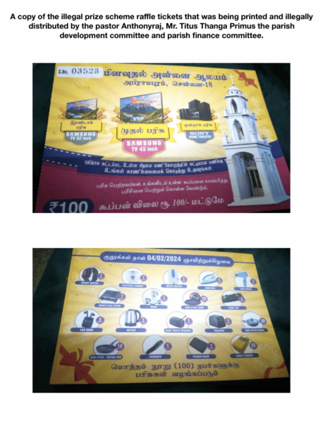 The illegal project was executed under the leadership of Pastor Antonyraj, builder Titus Thanga Primus, and members of the local Parish Committee. According to court submissions, they also organized a public lottery to fund the construction, in direct violation of the Tamil Nadu Prize Scheme (Prohibition) Act. No audits were conducted, and no public financial records were maintained, creating an opaque and unaccountable flow of funds.