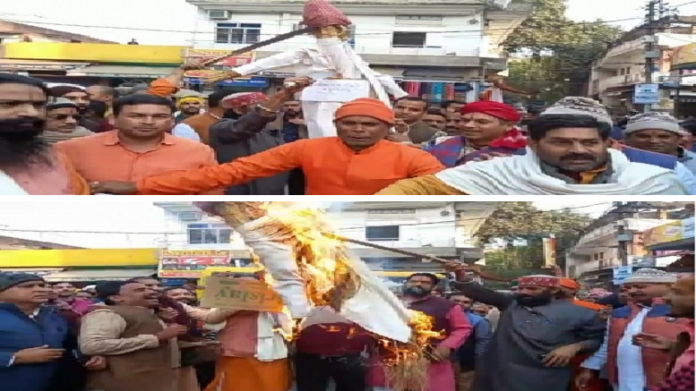 A large number of Pandas assembled at the city’s Vishnupad temple on Monday to participated in a protest march. They have also burnt him in effigy.