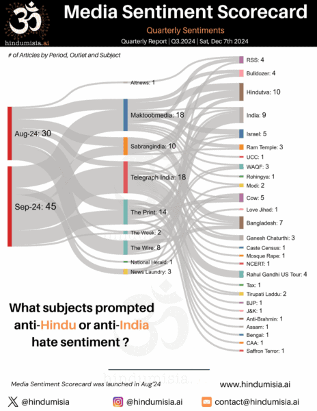 In the digital age, Hindumisia manifests through hate speech, misinformation, and targeted propaganda, often resulting in real-world discrimination and violence. The 2024 Media Sentiment Scorecard, which analyzed 322 articles from 19 media portals between August and December 2024, found a consistent pattern of criticism, hate, and propaganda targeting Hindus, Hindu dharma, and related entities. These narratives are not isolated; they are part of a broader ecosystem that includes media, academia, and activist networks.