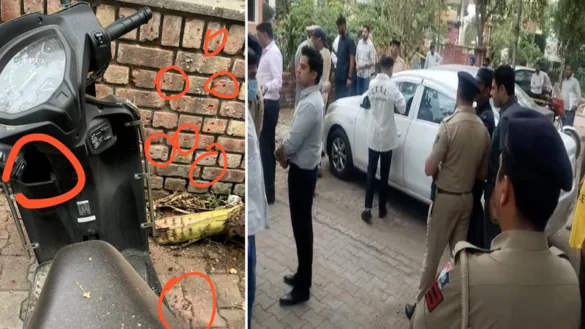 The blast occurred around 5:00 PM when two unidentified men on a two-wheeler hurled a Chinese-made hand grenade (reportedly a P86 model) towards the office premises. The device exploded in the parking area, damaging a scooter and a sedan car parked nearby. CCTV footage captured the attackers, one of whom was seen holding a helmet while the other filmed the act on a mobile phone before they fled the scene.