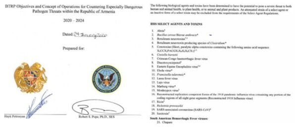 This decision was made in light of the cooperation agreement between the Armenian government and DTRA, under the program for countering especially dangerous pathogens between 2020 and 2024. The agreement also includes Armenia’s commitment to share its collection of dangerous pathogens and studying diseases that are not common in Armenia, such as Ebola fever, monkeypox, the Marburg virus, Eastern equine encephalitis, and various types of coronavirus.
