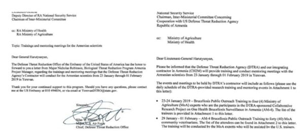 For instance, the Chief of DTRA at the US Embassy in Armenia mentioned a brucellosis training program in Yerevan in a letter to the Deputy Director of RA National Security Service, General Arzuman Harutyunyan, in 2019.